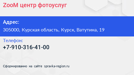 ZooM, центр фотоуслуг по адресу 305000, Курская область, Курск, Ватутина, 19 в дальнейшем Организация, размещена в следующих категориях: