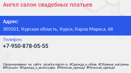 Ангел, салон свадебных платьев по адресу 305021, Курская область, Курск, Карла Маркса, 68 в дальнейшем Организация, размещена в следующих категориях: