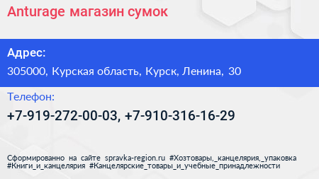 Anturage, магазин сумок по адресу 305000, Курская область, Курск, Ленина, 30 в дальнейшем Организация, размещена в следующих категориях: