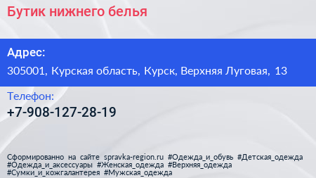 Бутик нижнего белья по адресу 305001, Курская область, Курск, Верхняя Луговая, 13 в дальнейшем Организация, размещена в следующих категориях: