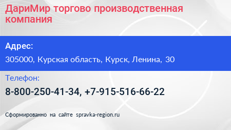 ДариМир, торгово-производственная компания по адресу 305000, Курская область, Курск, Ленина, 30 в дальнейшем Организация, размещена в следующих категориях: