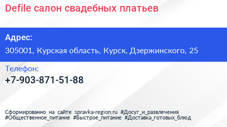 Defile, салон свадебных платьев по адресу 305001, Курская область, Курск, Дзержинского, 25 в дальнейшем Организация, размещена в следующих категориях: