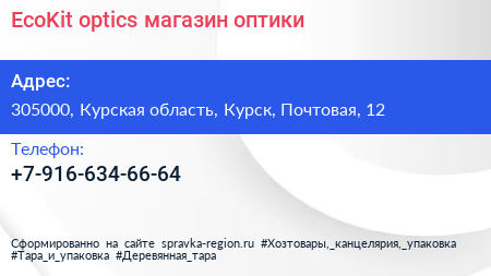EcoKit optics, магазин оптики по адресу 305000, Курская область, Курск, Почтовая, 12 в дальнейшем Организация, размещена в следующих категориях: