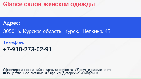 Glance, салон женской одежды по адресу 305016, Курская область, Курск, Щепкина, 4Б в дальнейшем Организация, размещена в следующих категориях: