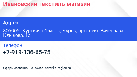 Ивановский текстиль, магазин по адресу 305005, Курская область, Курск, проспект Вячеслава Клыкова, 1а в дальнейшем Организация, размещена в следующих категориях: