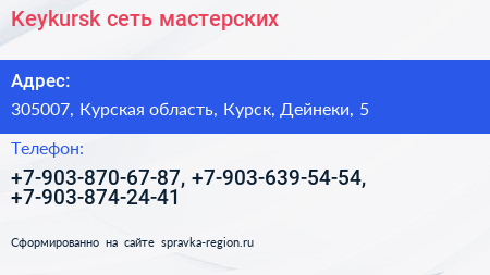 Keykursk, сеть мастерских по адресу 305007, Курская область, Курск, Дейнеки, 5 в дальнейшем Организация, размещена в следующих категориях:
