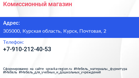 Комиссионный магазин по адресу 305000, Курская область, Курск, Почтовая, 2 в дальнейшем Организация, размещена в следующих категориях: