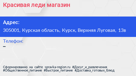 Красивая леди, магазин по адресу 305001, Курская область, Курск, Верхняя Луговая, 13в в дальнейшем Организация, размещена в следующих категориях: