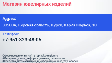 Магазин ювелирных изделий по адресу 305004, Курская область, Курск, Карла Маркса, 10 в дальнейшем Организация, размещена в следующих категориях: