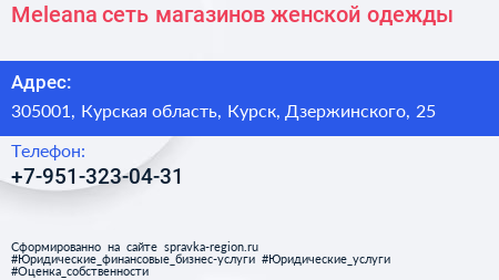 Meleana, сеть магазинов женской одежды по адресу 305001, Курская область, Курск, Дзержинского, 25 в дальнейшем Организация, размещена в следующих категориях: