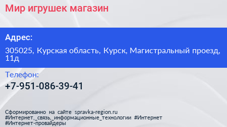 Мир игрушек, магазин по адресу 305025, Курская область, Курск, Магистральный проезд, 11д в дальнейшем Организация, размещена в следующих категориях: