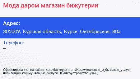 Мода даром, магазин бижутерии по адресу 305009, Курская область, Курск, Октябрьская, 80а в дальнейшем Организация, размещена в следующих категориях: