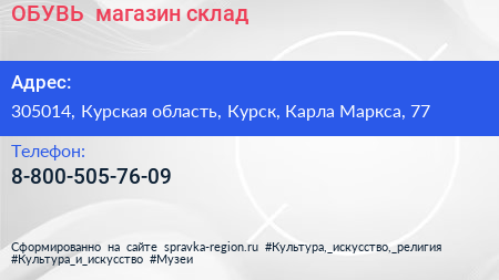 ОБУВЬ+, магазин-склад по адресу 305014, Курская область, Курск, Карла Маркса, 77 в дальнейшем Организация, размещена в следующих категориях: