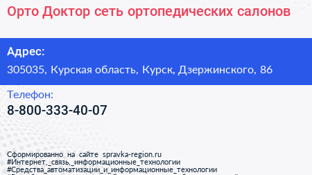 Орто-Доктор, сеть ортопедических салонов по адресу 305035, Курская область, Курск, Дзержинского, 86 в дальнейшем Организация, размещена в следующих категориях: