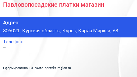 Павловопосадские платки, магазин по адресу 305021, Курская область, Курск, Карла Маркса, 68 в дальнейшем Организация, размещена в следующих категориях: