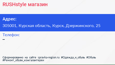 RUSHstyle, магазин по адресу 305001, Курская область, Курск, Дзержинского, 25 в дальнейшем Организация, размещена в следующих категориях: