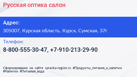 Русская оптика, салон по адресу 305007, Курская область, Курск, Сумская, 37г в дальнейшем Организация, размещена в следующих категориях:
