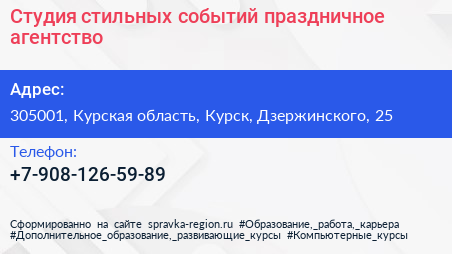 Студия стильных событий, праздничное агентство по адресу 305001, Курская область, Курск, Дзержинского, 25 в дальнейшем Организация, размещена в следующих категориях: