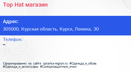 Top Hat, магазин по адресу 305000, Курская область, Курск, Ленина, 30 в дальнейшем Организация, размещена в следующих категориях: