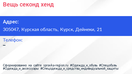 Вещь!, секонд-хенд по адресу 305047, Курская область, Курск, Дейнеки, 21 в дальнейшем Организация, размещена в следующих категориях: