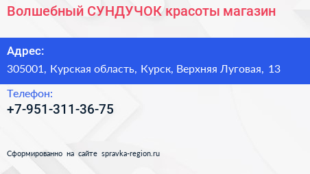 Волшебный СУНДУЧОК красоты, магазин по адресу 305001, Курская область, Курск, Верхняя Луговая, 13 в дальнейшем Организация, размещена в следующих категориях:
