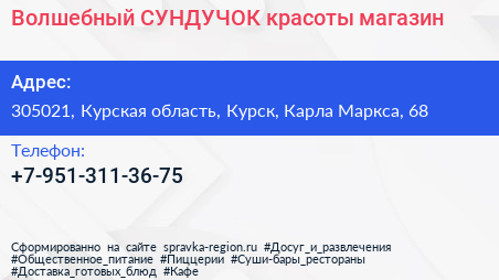 Волшебный СУНДУЧОК красоты, магазин по адресу 305021, Курская область, Курск, Карла Маркса, 68 в дальнейшем Организация, размещена в следующих категориях: