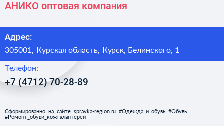 АНИКО, оптовая компания по адресу 305001, Курская область, Курск, Белинского, 1 в дальнейшем Организация, размещена в следующих категориях: