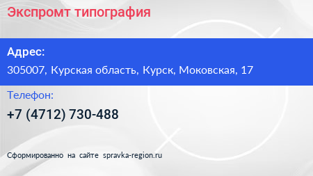 Экспромт, типография по адресу 305007, Курская область, Курск, Моковская, 17 в дальнейшем Организация, размещена в следующих категориях: