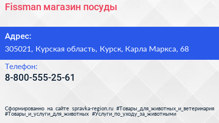 Fissman, магазин посуды по адресу 305021, Курская область, Курск, Карла Маркса, 68 в дальнейшем Организация, размещена в следующих категориях: