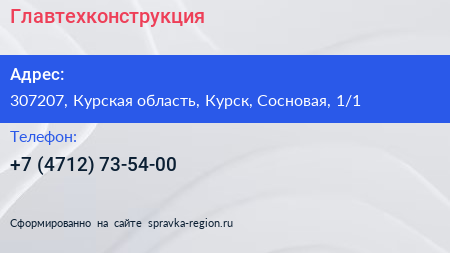 Главтехконструкция по адресу 307207, Курская область, Курск, Сосновая, 1/1 в дальнейшем Организация, размещена в следующих категориях: