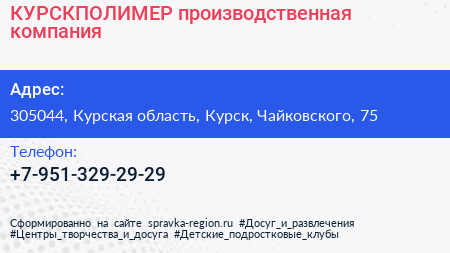 КУРСКПОЛИМЕР, производственная компания по адресу 305044, Курская область, Курск, Чайковского, 75 в дальнейшем Организация, размещена в следующих категориях: