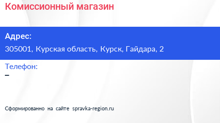Комиссионный магазин по адресу 305001, Курская область, Курск, Гайдара, 2 в дальнейшем Организация, размещена в следующих категориях: