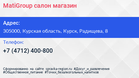 MatiGroup, салон-магазин по адресу 305000, Курская область, Курск, Радищева, 8 в дальнейшем Организация, размещена в следующих категориях: