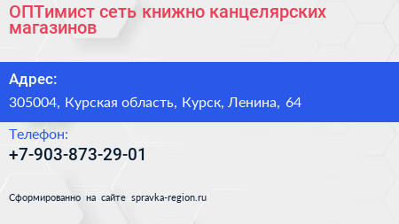ОПТимист, сеть книжно-канцелярских магазинов по адресу 305004, Курская область, Курск, Ленина, 64 в дальнейшем Организация, размещена в следующих категориях: