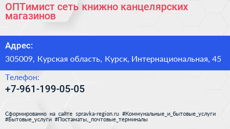 ОПТимист, сеть книжно-канцелярских магазинов по адресу 305009, Курская область, Курск, Интернациональная, 45 в дальнейшем Организация, размещена в следующих категориях: