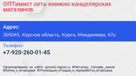 ОПТимист, сеть книжно-канцелярских магазинов по адресу 305045, Курская область, Курск, Менделеева, 47а в дальнейшем Организация, размещена в следующих категориях: