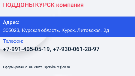 ПОДДОНЫ КУРСК, компания по адресу 305023, Курская область, Курск, Литовская, 2д в дальнейшем Организация, размещена в следующих категориях: