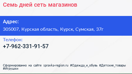 Семь дней, сеть магазинов по адресу 305007, Курская область, Курск, Сумская, 37г в дальнейшем Организация, размещена в следующих категориях: