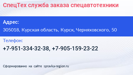 СпецТех, служба заказа спецавтотехники по адресу 305018, Курская область, Курск, Черняховского, 50 в дальнейшем Организация, размещена в следующих категориях: