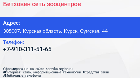 Бетховен, сеть зооцентров по адресу 305007, Курская область, Курск, Сумская, 44 в дальнейшем Организация, размещена в следующих категориях: