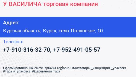 У ВАСИЛИЧА, торговая компания по адресу Курская область, Курск, село Полянское, 10 в дальнейшем Организация, размещена в следующих категориях: