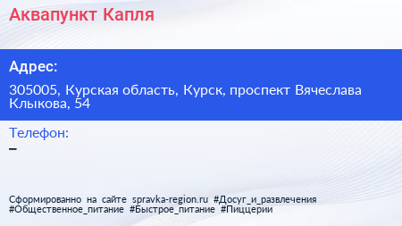 Аквапункт Капля по адресу 305005, Курская область, Курск, проспект Вячеслава Клыкова, 54 в дальнейшем Организация, размещена в следующих категориях: