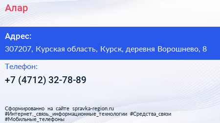 Алар по адресу 307207, Курская область, Курск, деревня Ворошнево, 8 в дальнейшем Организация, размещена в следующих категориях: