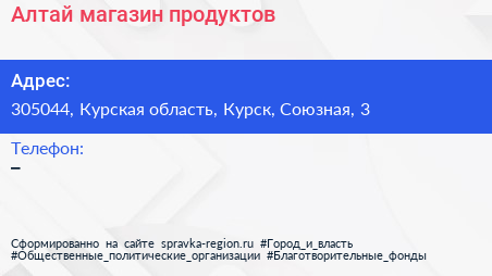 Алтай, магазин продуктов по адресу 305044, Курская область, Курск, Союзная, 3 в дальнейшем Организация, размещена в следующих категориях: