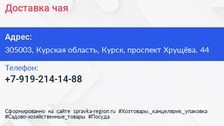 Доставка чая по адресу 305003, Курская область, Курск, проспект Хрущёва, 44 в дальнейшем Организация, размещена в следующих категориях:
