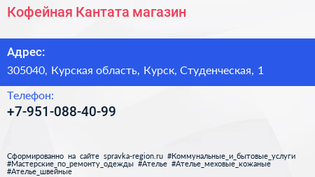 Кофейная Кантата, магазин по адресу 305040, Курская область, Курск, Студенческая, 1 в дальнейшем Организация, размещена в следующих категориях: