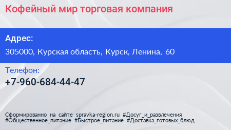 Кофейный мир, торговая компания по адресу 305000, Курская область, Курск, Ленина, 60 в дальнейшем Организация, размещена в следующих категориях: