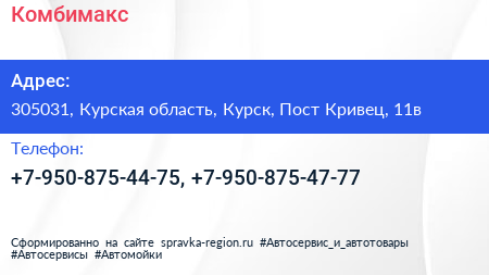 Комбимакс по адресу 305031, Курская область, Курск, Пост Кривец, 11в в дальнейшем Организация, размещена в следующих категориях: