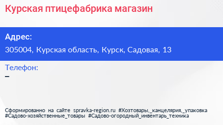 Курская птицефабрика, магазин по адресу 305004, Курская область, Курск, Садовая, 13 в дальнейшем Организация, размещена в следующих категориях: