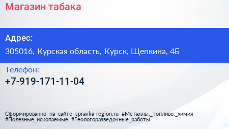 Магазин табака по адресу 305016, Курская область, Курск, Щепкина, 4Б в дальнейшем Организация, размещена в следующих категориях: